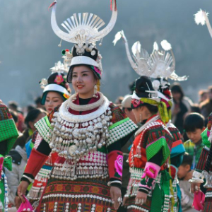 3月2日,在贵州省凯里市舟溪镇,苗族姑娘身着盛装跳起芦笙舞。