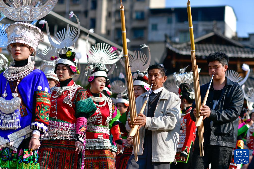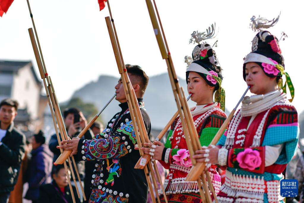 3月2日,在贵州省凯里市舟溪镇,苗族群众在吹奏芦笙。