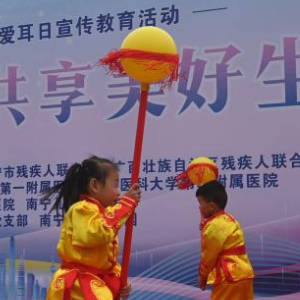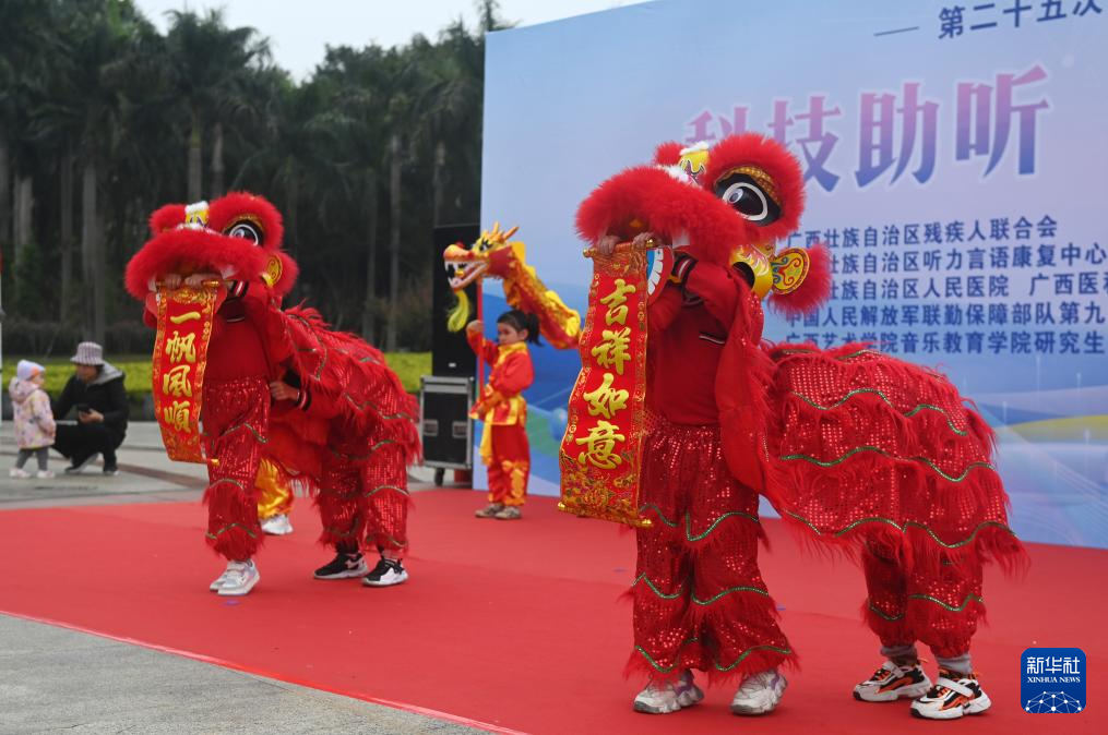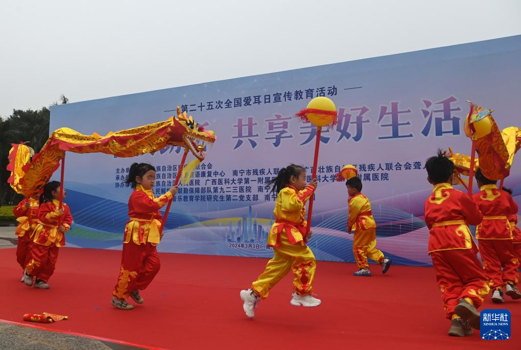 3月3日,在广西南宁市举行的全国爱耳日宣传教育活动现场,由广西壮族自治区听力言语康复中心的听障儿童进行的舞狮舞龙表演,赢得全场观众热烈掌声。该康复中心的老师们希望通过这种形式,提升听障孩子的注意力、身体动作协调性和节奏感,培养他们语言理解、表达、交往能力以及团队合作意识。