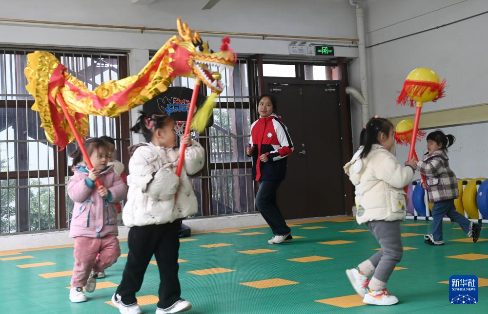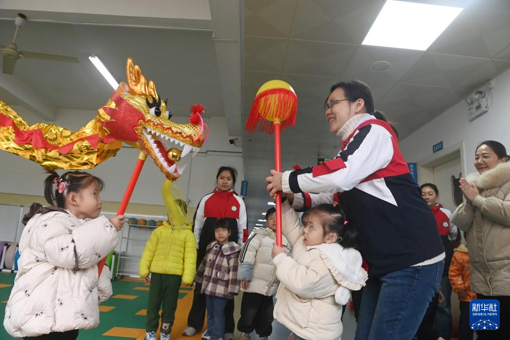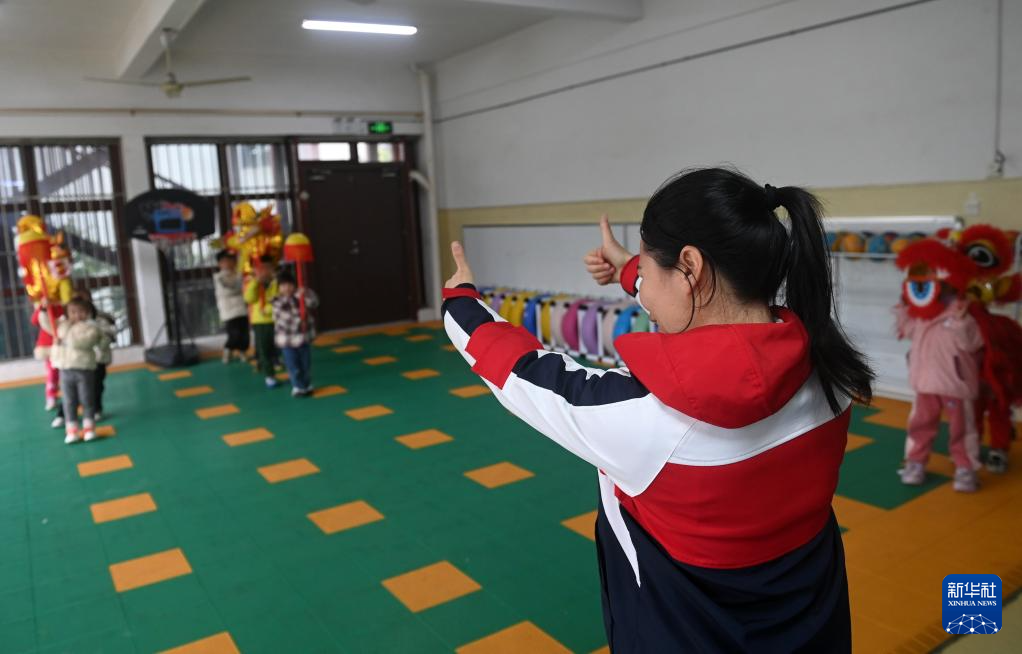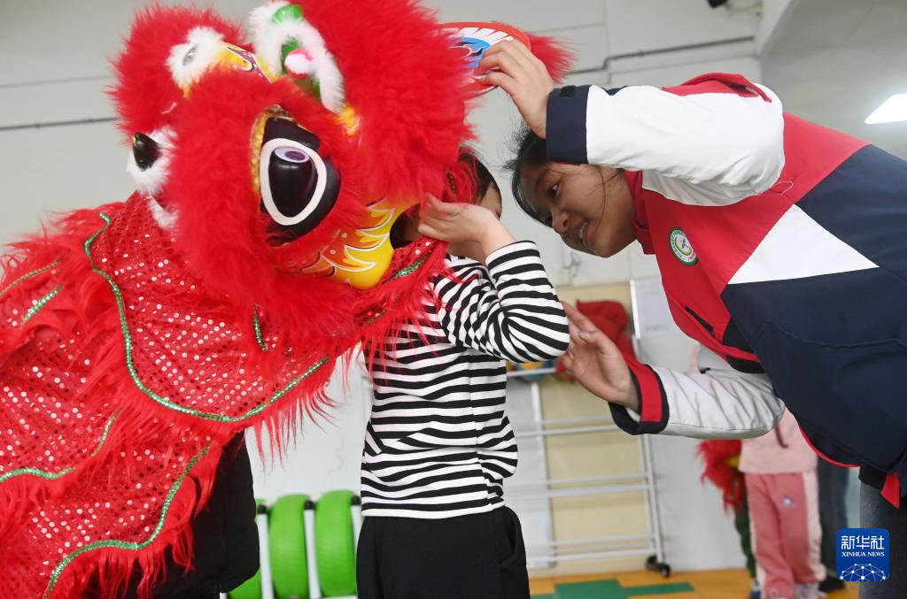 在广西壮族自治区听力言语康复中心,老师在教孩子们舞龙舞狮(2月28日摄)。