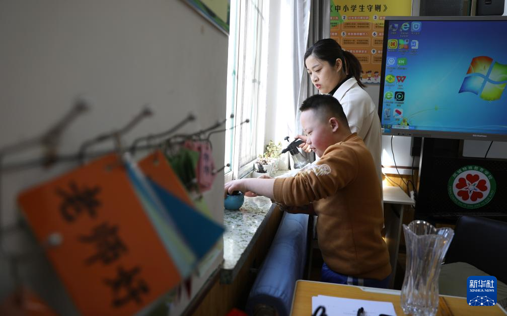 3月1日,凤城特殊教育学校的老师赵阅(后)和学生迟云峥一起整理教室窗台,让孩子们提高自理和动手能力是特殊教育的重要内容。