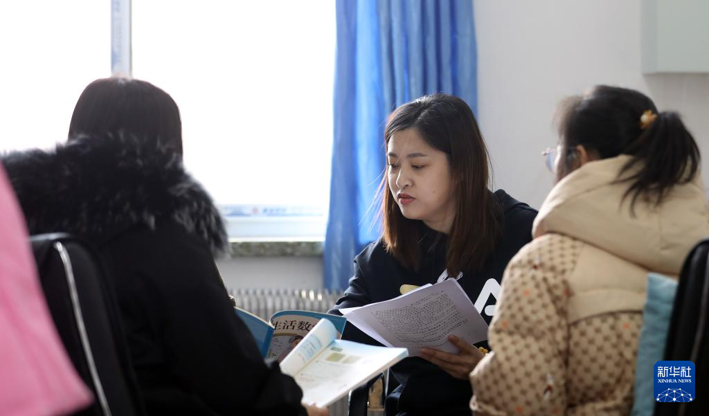 2月29日,凤城特殊教育学校的老师赵阅和数学组其他老师在集体备课。