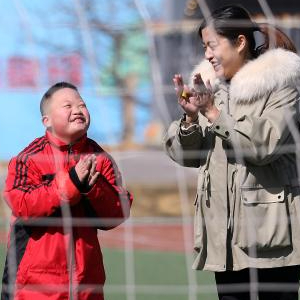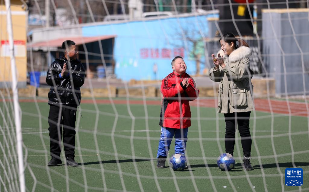 3月1日,凤城特殊教育学校的老师赵阅(右)和学生迟云峥(中)、姜承伯来到操场上踢球。射门前,迟云峥说要给自己加油,赵阅和姜承伯为他鼓起掌来。