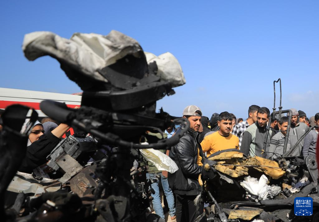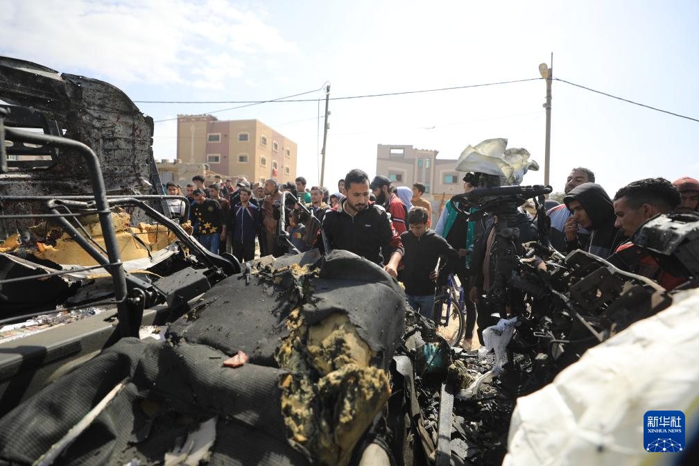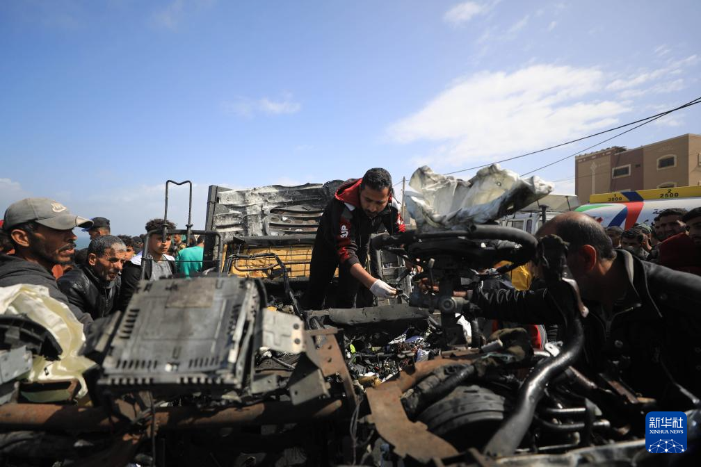3月3日,在加沙地带中部城市代尔拜拉赫,人们查看遭以军袭击的卡车。