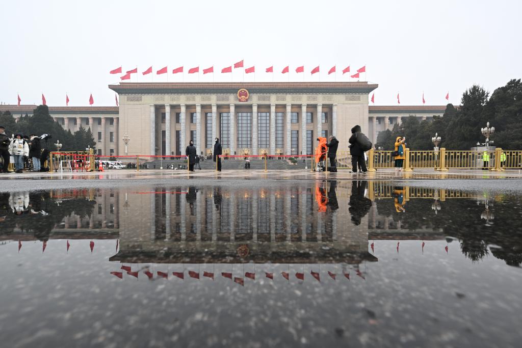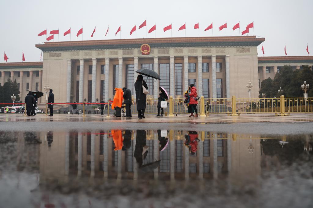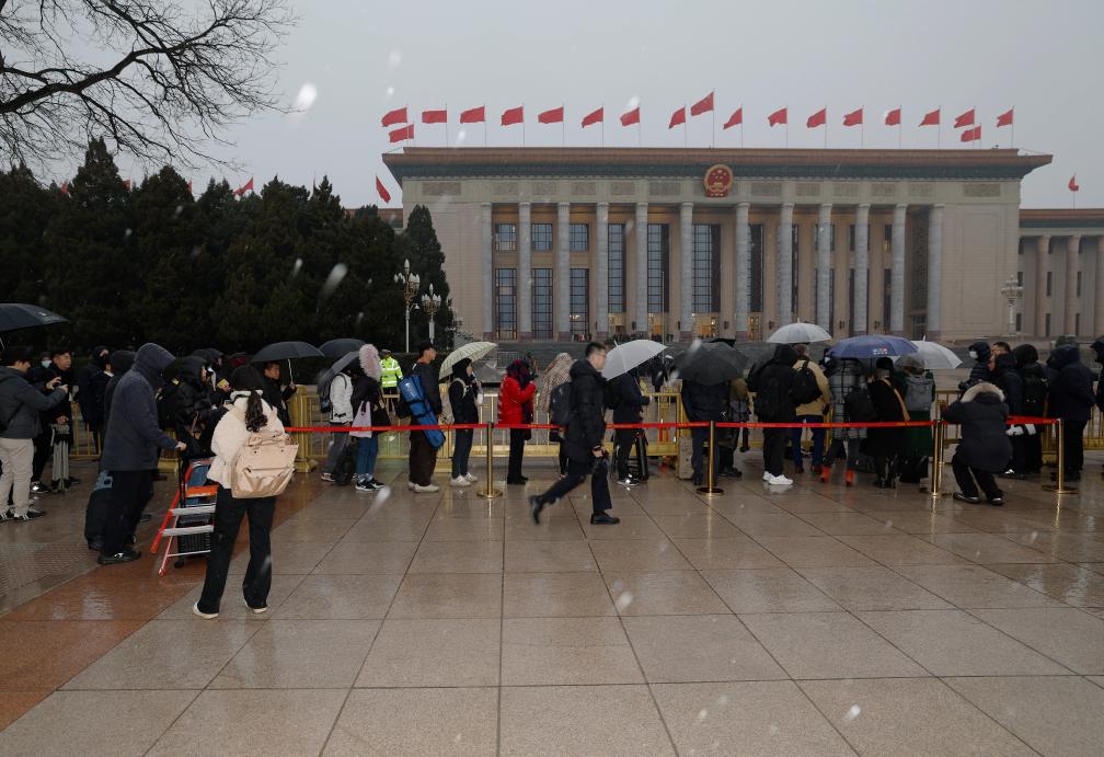 3月5日,第十四届全国人民代表大会第二次会议在北京人民大会堂开幕。这是记者冒着雨雪排队等待进入人民大会堂。