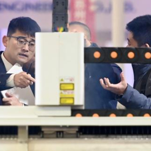 3月6日,在第二十届天津工博会展区,参展商为客户介绍一款激光切割机。