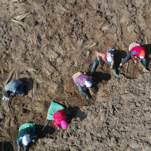 3月7日,在岷县梅川镇中药材标准化种植基地内,药农在采挖黄芪种苗(无人机照片)。