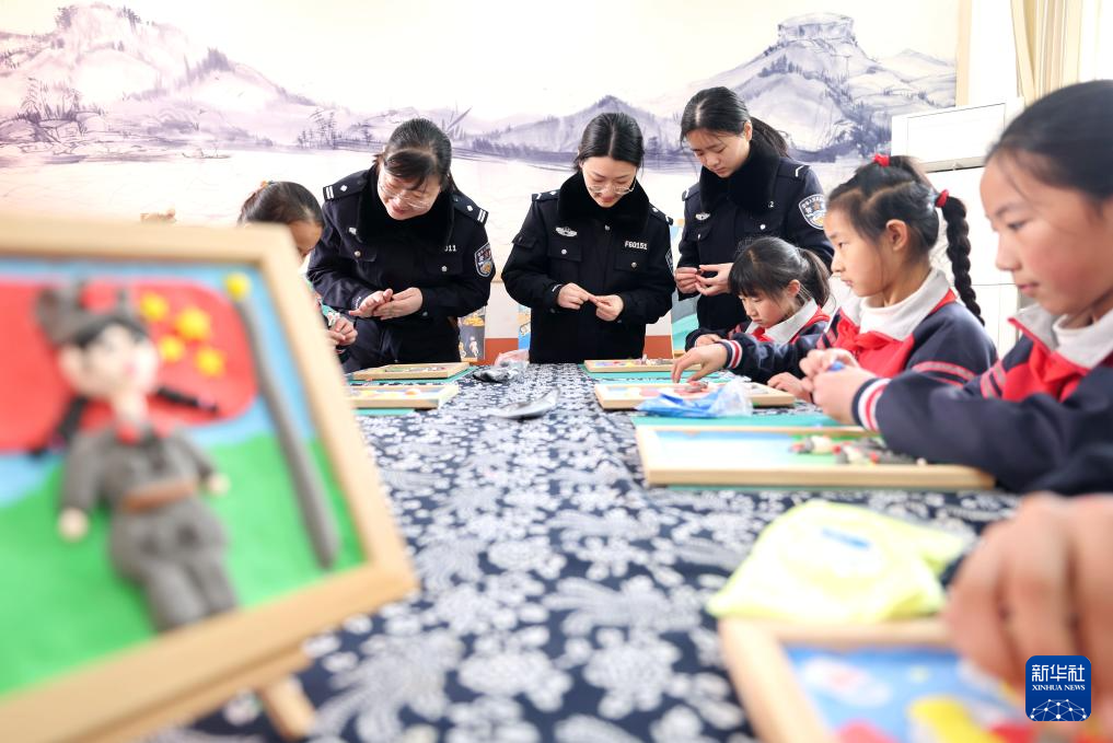 3月7日,山东省临沂市沂南县公安局巾帼志愿服务队的女民警和留守儿童们一起做手工泥塑。