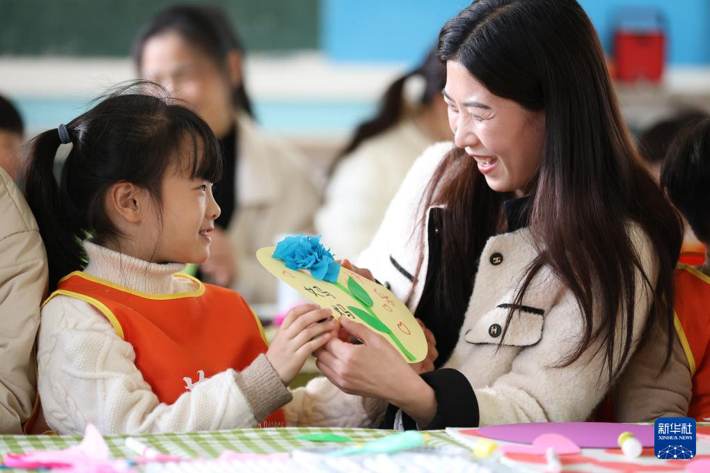 3月7日,在山东省临沂市郯城县郯城街道东南村英杰幼儿园,一名小女孩将制作完成的画献给妈妈。