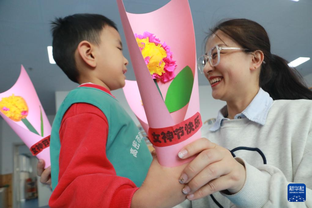 3月7日,在山东省高密市凤鸣实验幼儿园,小朋友向老师献上自己制作的手工创意作品表达祝福。
