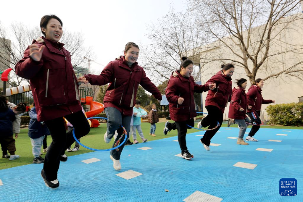 3月7日,在江苏省连云港市核电钟声幼儿园,女教师在进行齐心协力趣味游戏。