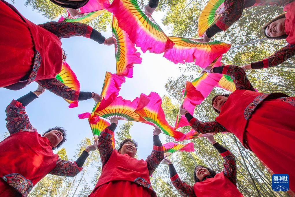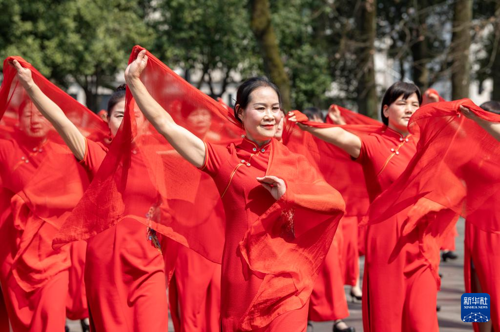 3月7日,在河南省焦作市博爱县前莎庄村,村民们在迎“三八”活动中跳舞。