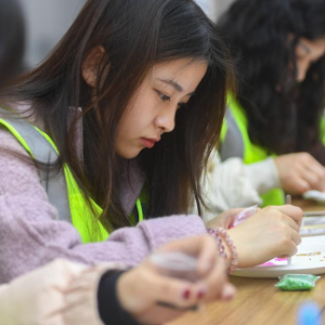 3月7日,在江苏南京,中建三局一公司扬子江智慧中心项目的女职工们在手工老师的指导下制作“花样相框”。