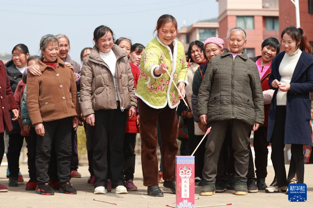 3月7日,在贵州省黔东南苗族侗族自治州岑巩县㵲水街道大榕凉塘社区,妇女们在迎“三八”活动中参与趣味投壶。