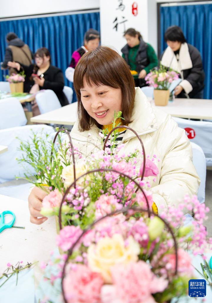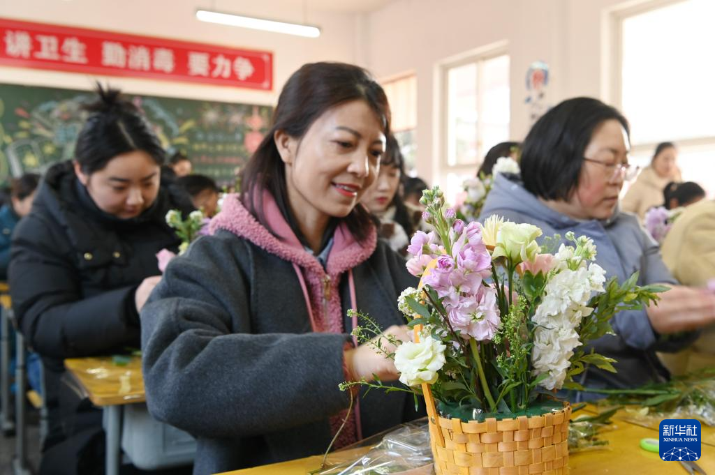 3月7日,在河南省沁阳市第二小学,女教师参加“邂逅指尖浪漫,静享花艺时光”插花活动。