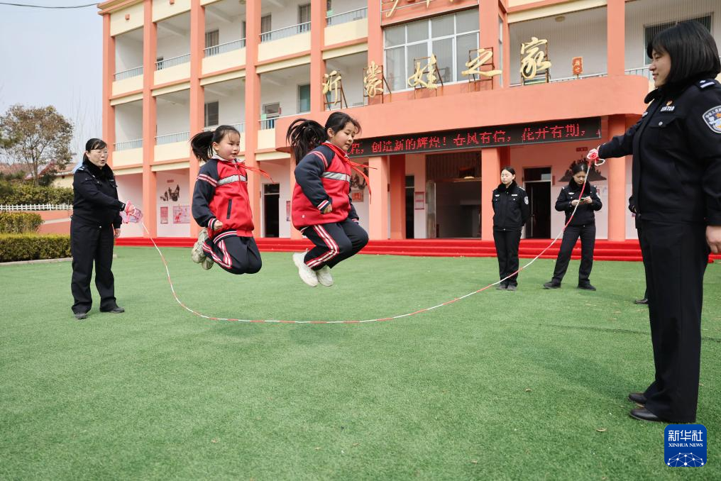 3月7日,山东省临沂市沂南县公安局巾帼志愿服务队的女民警和留守儿童一起跳绳做游戏。