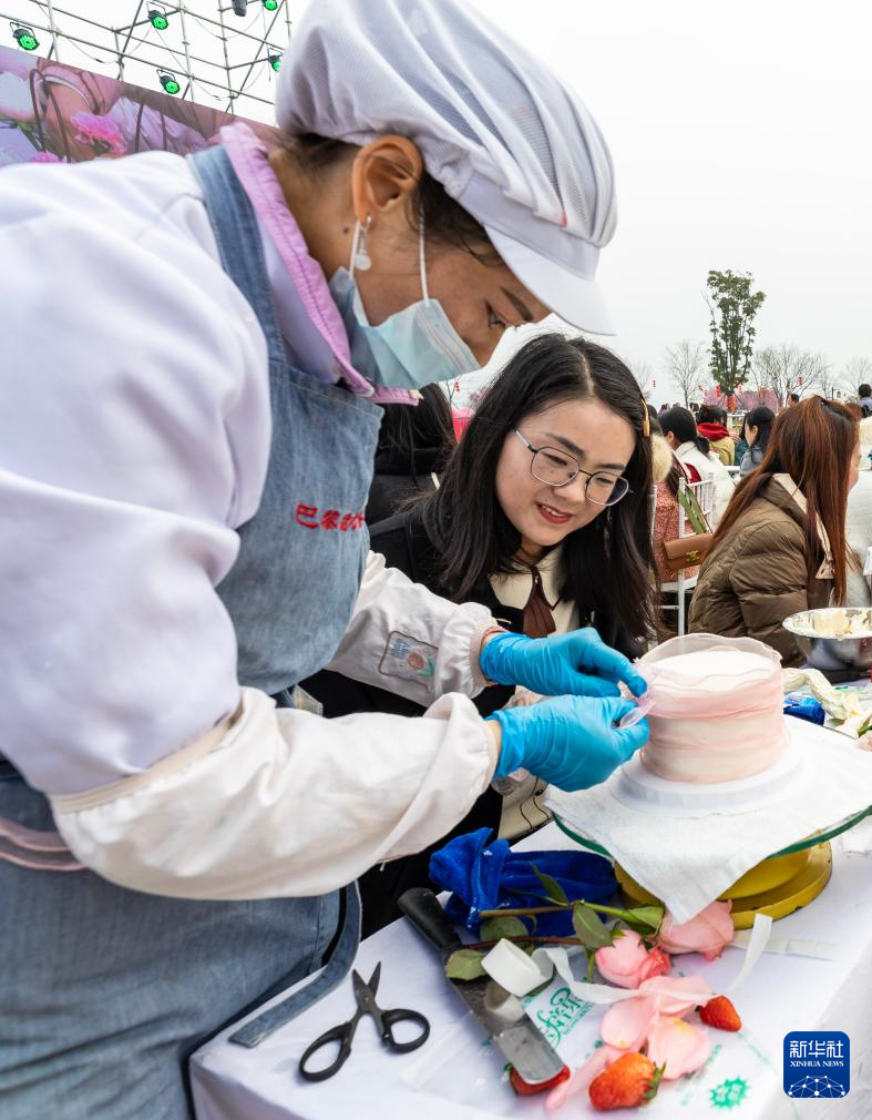 3月7日,在陕西省西安市高新区一处安置房项目建设现场,中建安装华西公司第一分公司的女职工们在制作蛋糕。