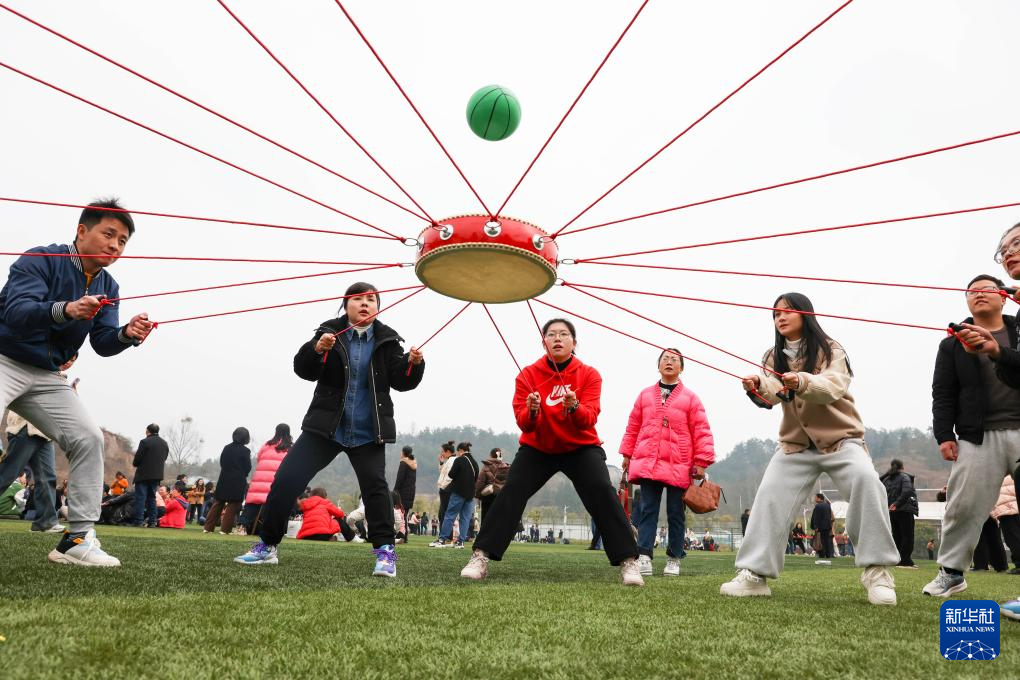 3月7日,人们在贵州省黔东南苗族侗族自治州岑巩县体育馆参加趣味游戏。