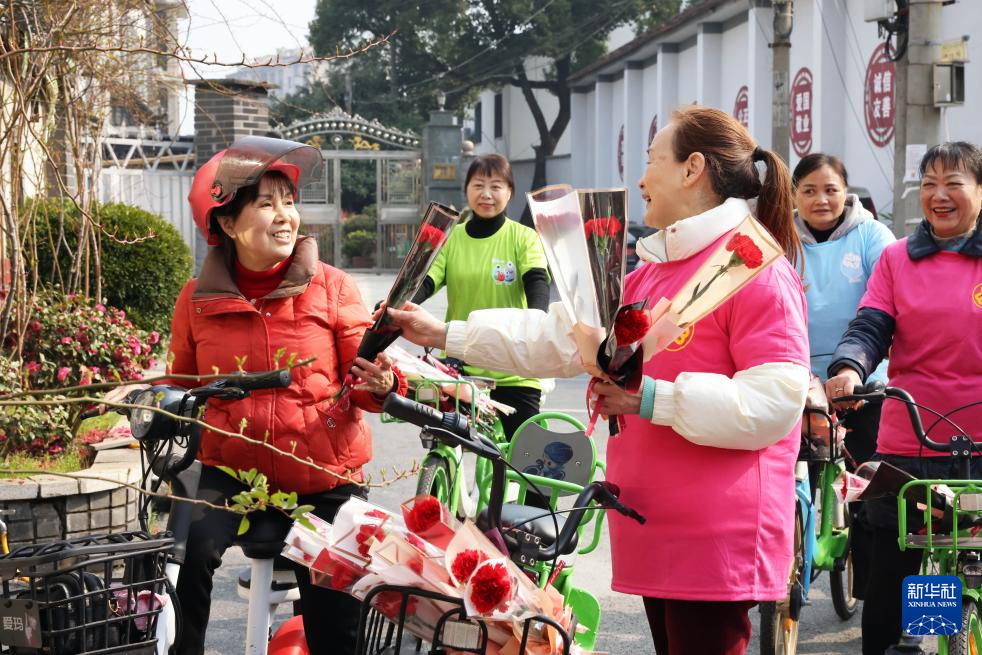3月7日,在浙江省湖州市德清县乾元镇东郊社区,志愿者将康乃馨送给绿色出行的女性居民。