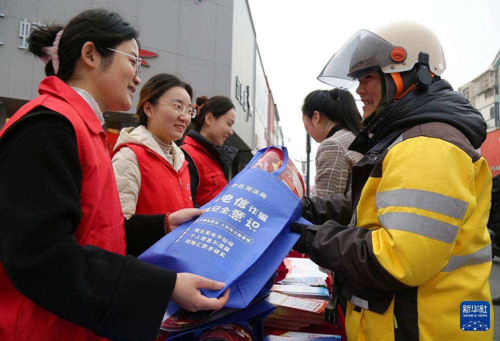 3月7日,在山东省枣庄市市中区一处商业街区,志愿者向外卖女骑手宣传法律知识。