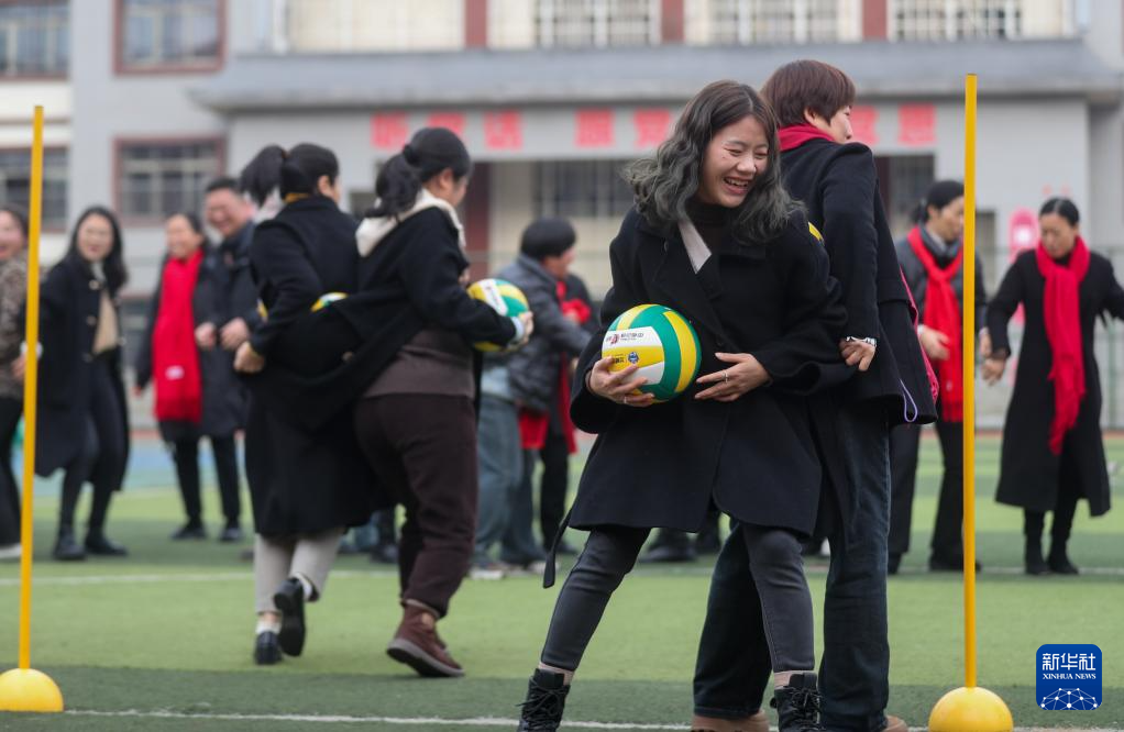 3月6日,在河南省焦作市温县一中,女教师在参加同心击鼓颠球比赛。