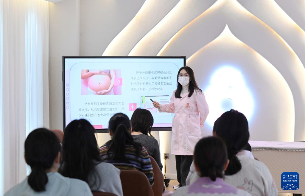 3月7日,在河北石家庄市桥西区一家月子中心,产妇在参加妇联组织开展的妇女健康公益讲座活动。