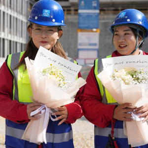 3月6日,在中建三局兰州大学榆中校区项目建设工地,王甜甜(左)和搭档的信号工袁婷婷收到单位送的妇女节鲜花。