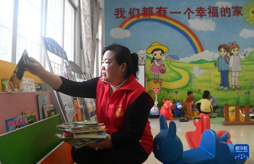 在广西宾阳县中华镇的一个“留守儿童之家”,张清秀整理孩子们的读物(3月5日摄)。