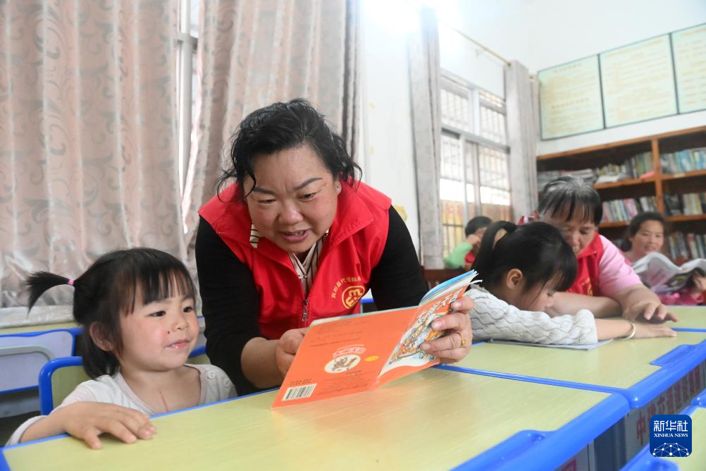 在广西宾阳县中华镇的一个“留守儿童之家”,张清秀(左二)陪小朋友阅读(3月5日摄)。