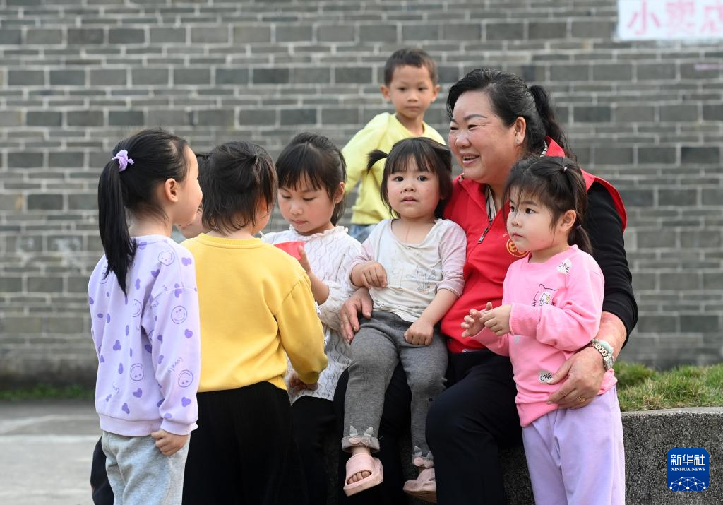 在广西宾阳县中华镇的一个“留守儿童之家”活动室外,张清秀和孩子们交流(3月5日摄)。