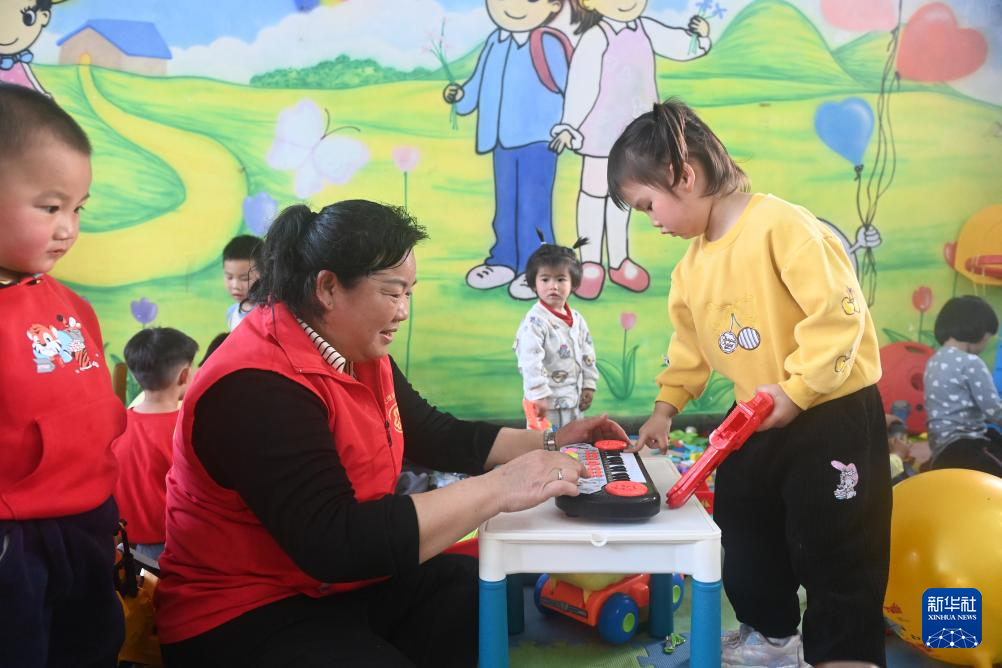 在广西宾阳县中华镇的一个“留守儿童之家”,张清秀和孩子们一起玩耍(3月5日摄)。