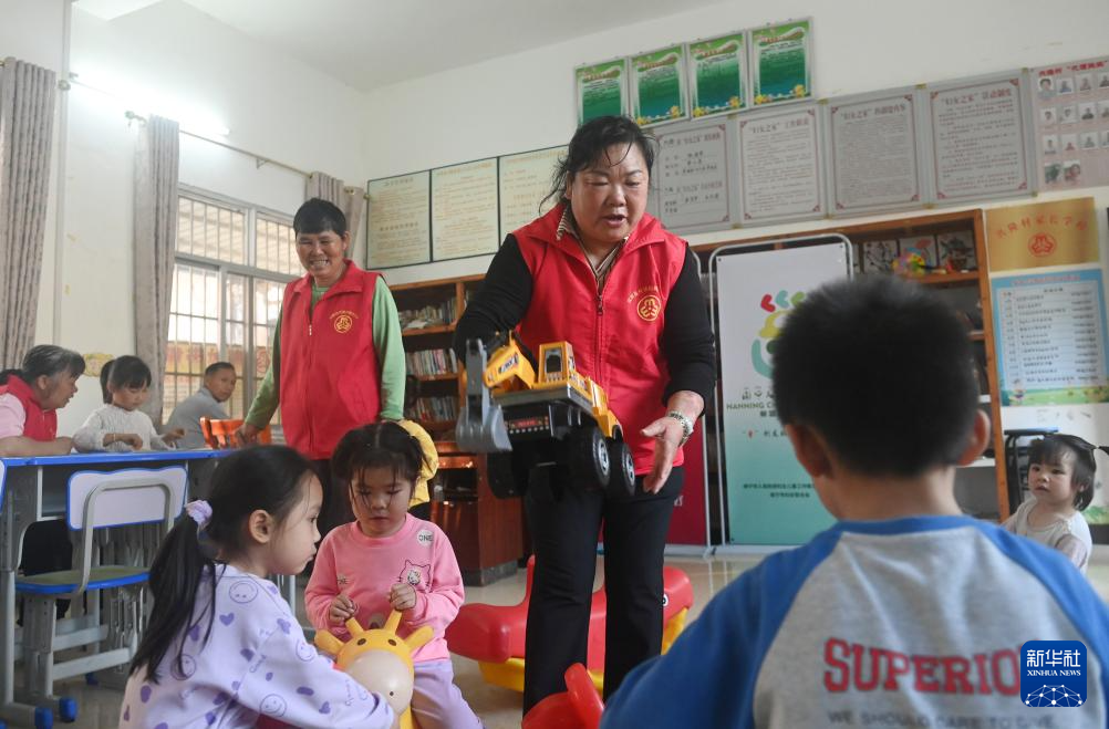 在广西宾阳县中华镇的一个“留守儿童之家”,张清秀和孩子们玩耍(3月5日摄)。
