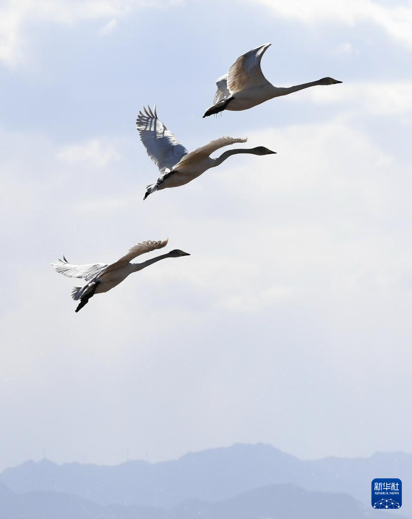 3月7日,在河北怀来官厅水库国家湿地公园,天鹅在空中飞舞。