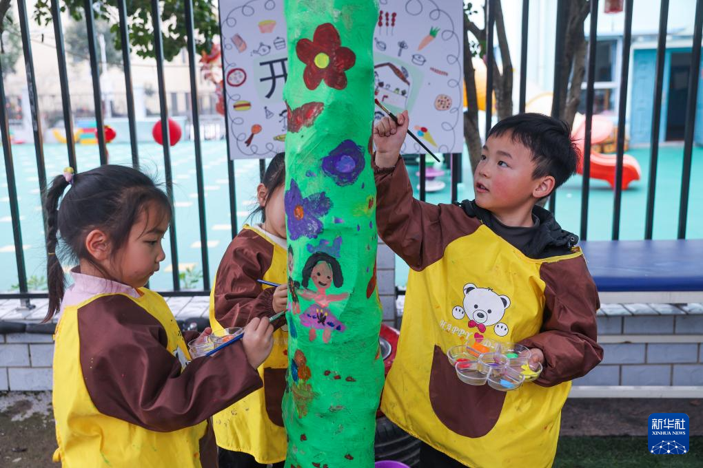 3月7日,诸暨市暨南街道南悦幼儿园开展“植此春色 绿意萌动”护绿添彩活动,孩子们在树身上绘制卡通图案。