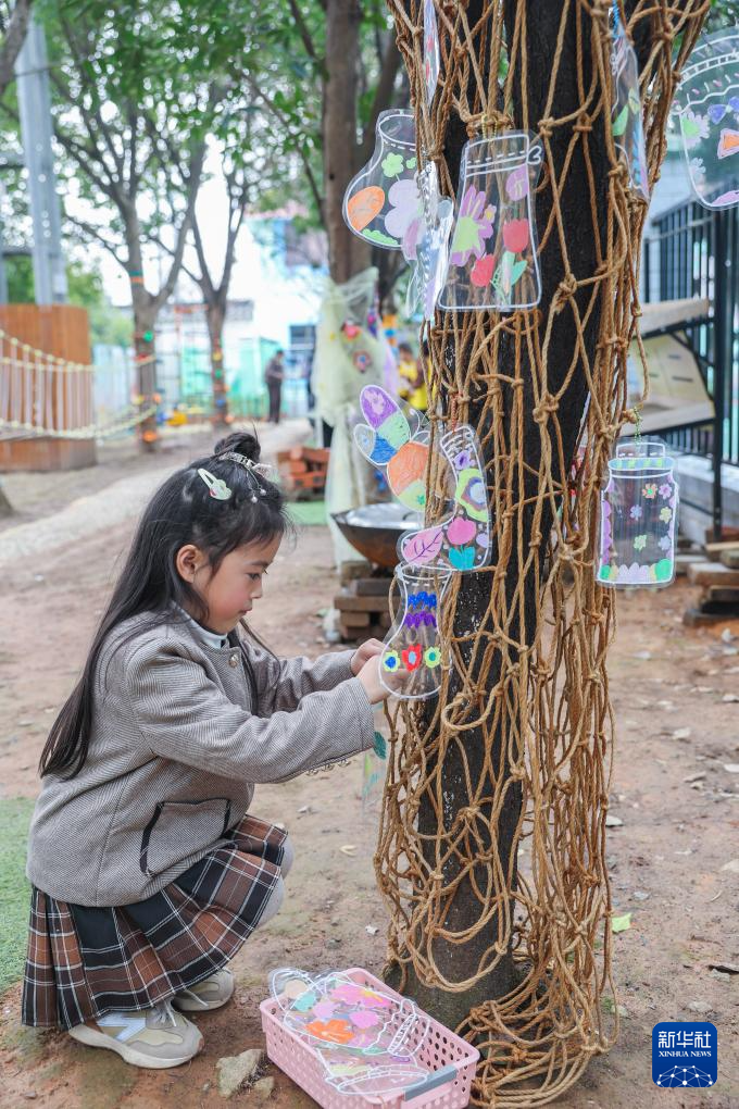 3月7日,诸暨市暨南街道南悦幼儿园开展“植此春色 绿意萌动”护绿添彩活动,孩子们把彩色手工艺品挂在树上“为大树穿花衣”。