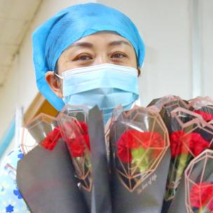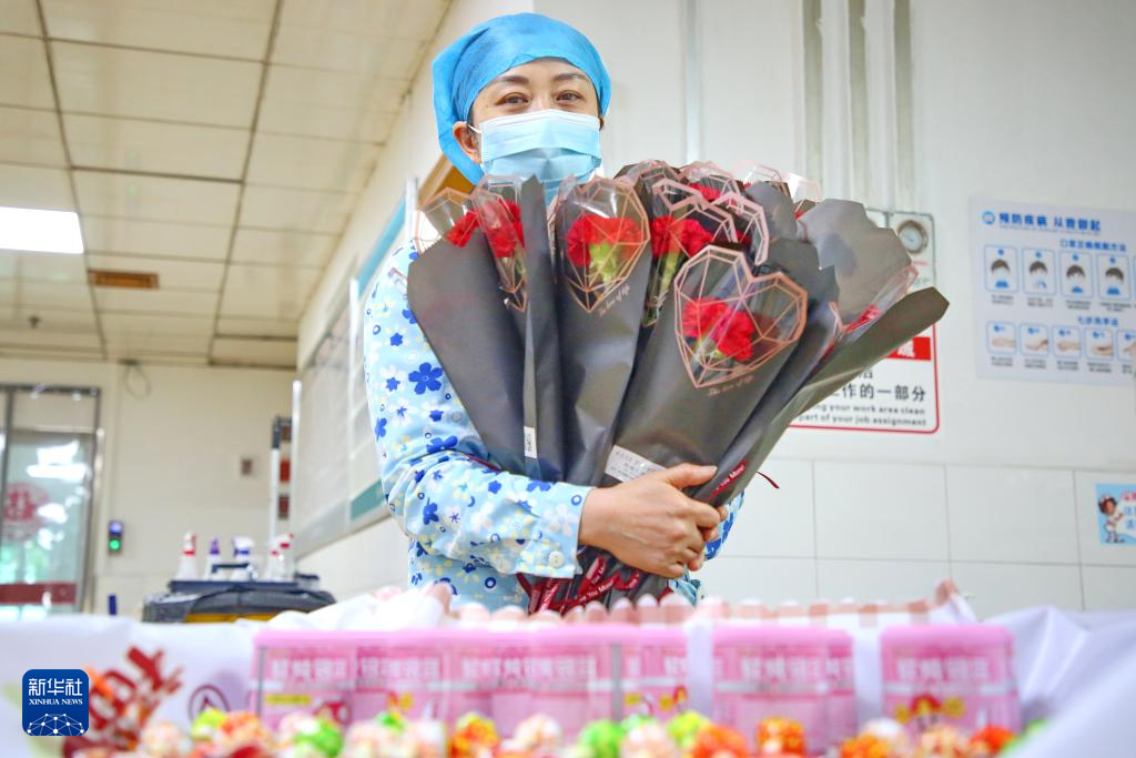 3月8日,浙江省嘉兴市海警医院的护士怀抱鲜花准备送给女患者。