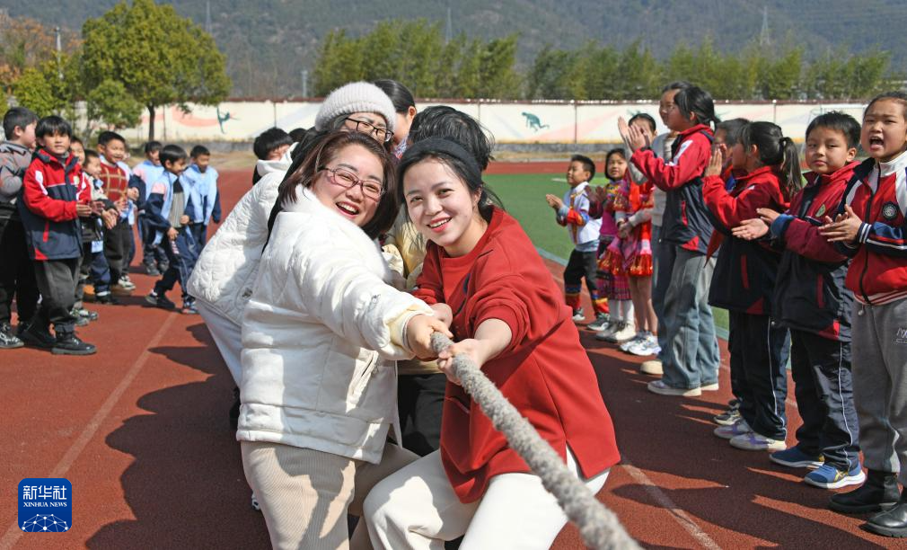 3月8日,浙江省台州市仙居县第五小学老师在参加拔河比赛。