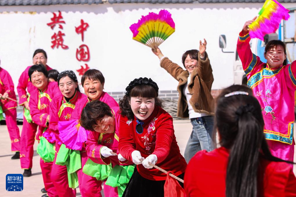 3月8日,河南省焦作市博爱县清化镇街道太子庄村的村民在进行拔河比赛。