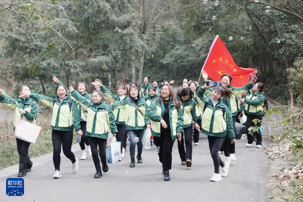 3月8日,贵州省黔东南苗族侗族自治州施秉县晨阳幼儿园的女老师在参加户外活动。