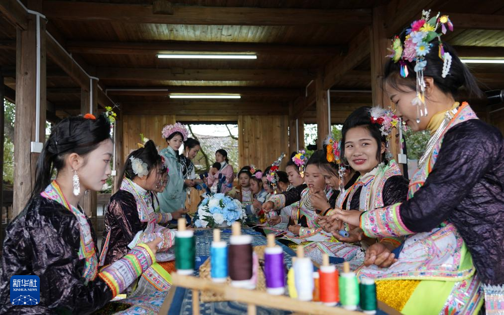 3月8日,苗族妇女在贵州省从江县丙妹镇岜沙村参加刺绣比赛。