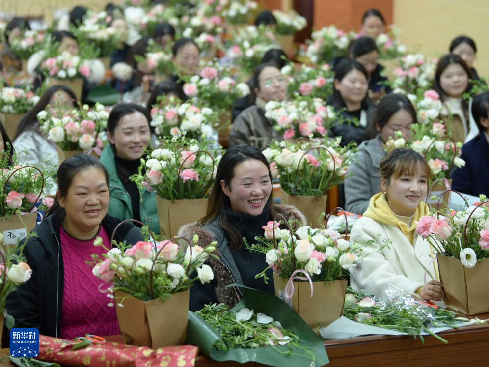 3月8日,贵州省毕节市百里杜鹃管理区的女职工们在参加插花活动。