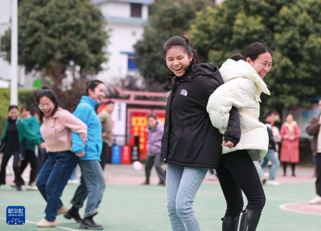 3月8日,贵州省从江县刚边壮族乡良田村的妇女们在参加趣味游戏。