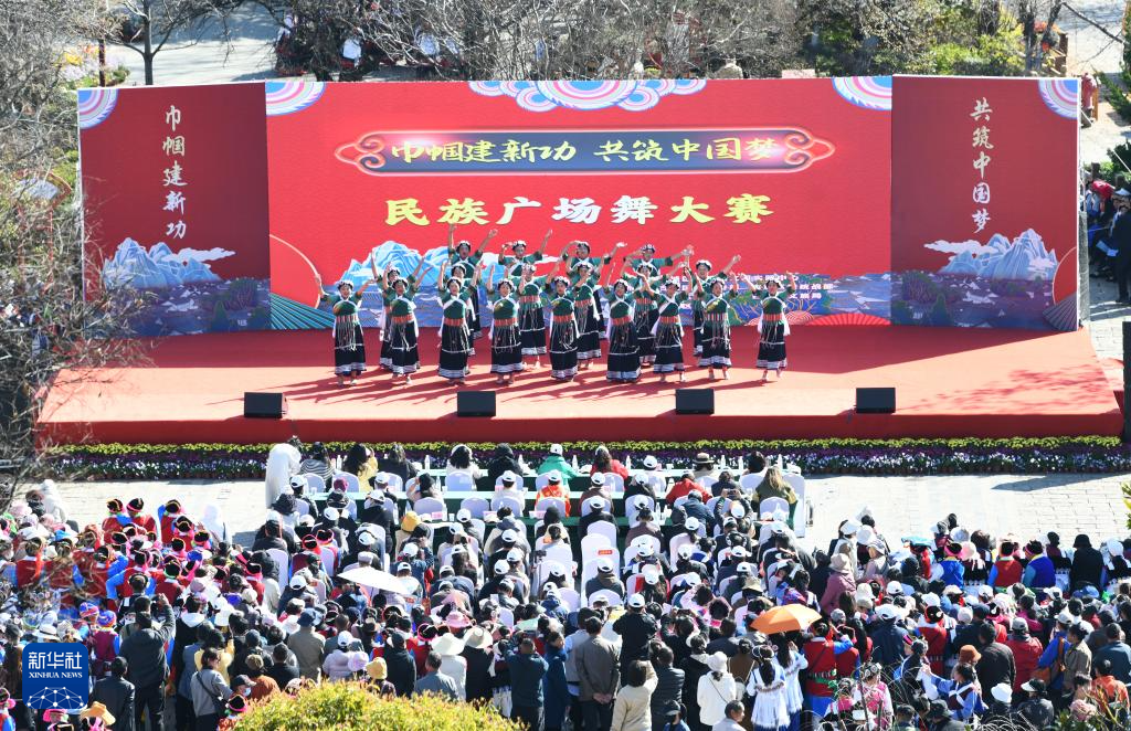 3月8日,各族群众在云南丽江古城参加民族广场舞大赛。
