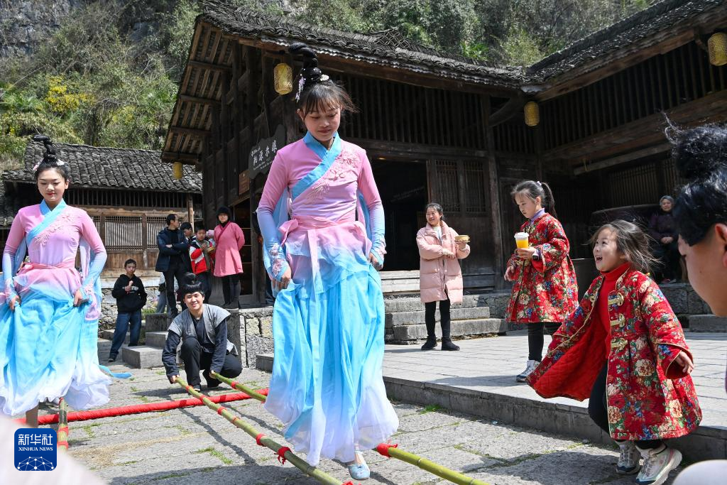 3月8日,游客在重庆市酉阳土家族苗族自治县桃花源景区体验民俗。