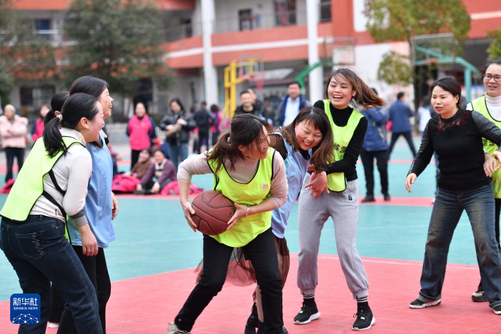 3月8日,女教师们在贵州省黔东南苗族侗族自治州黄平县新州镇第二小学参加篮球比赛。