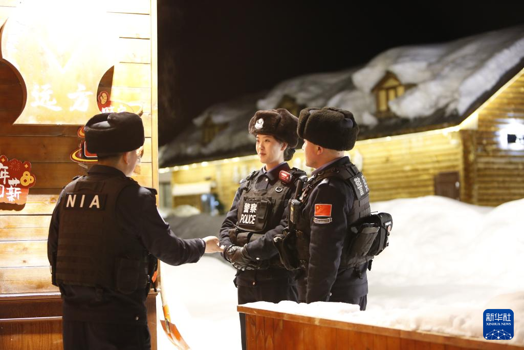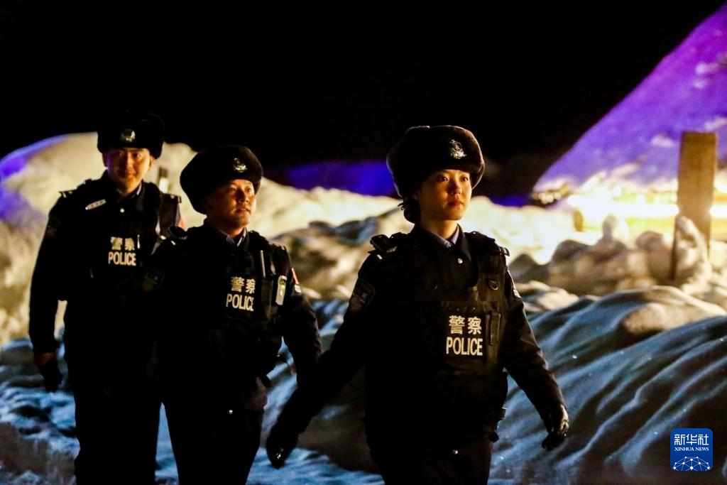 3月7日,在新疆阿勒泰地区禾木村,蒋慧芳(右)和同事在村中夜巡。