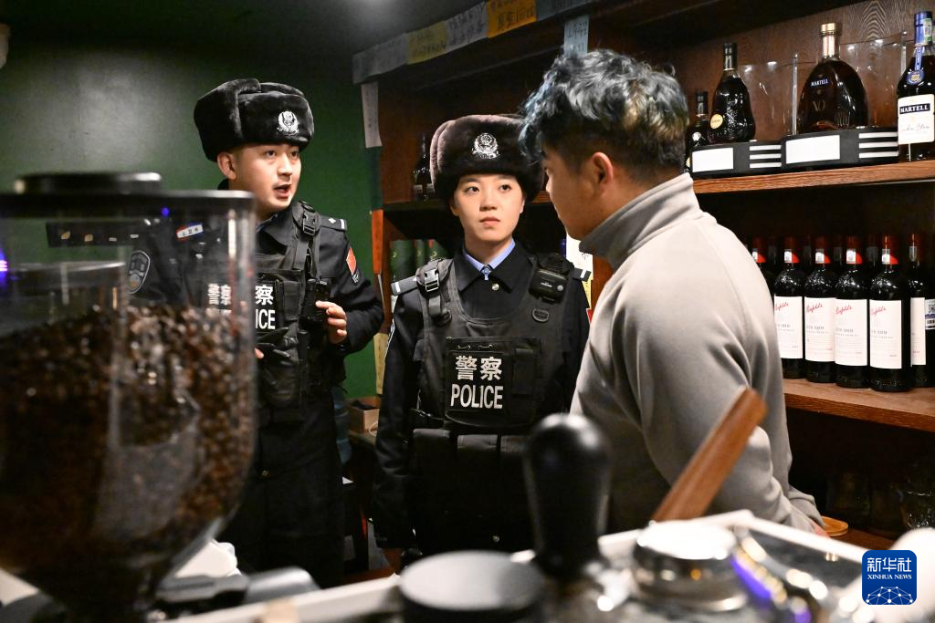 3月7日,在新疆阿勒泰地区禾木村,蒋慧芳(中)在师父王卫州带领下在一家酒吧检查。