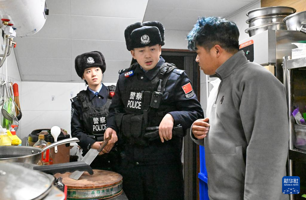 3月7日,在新疆阿勒泰地区禾木村,蒋慧芳(左)在师父王卫州带领下在一家酒吧后厨进行安全检查。