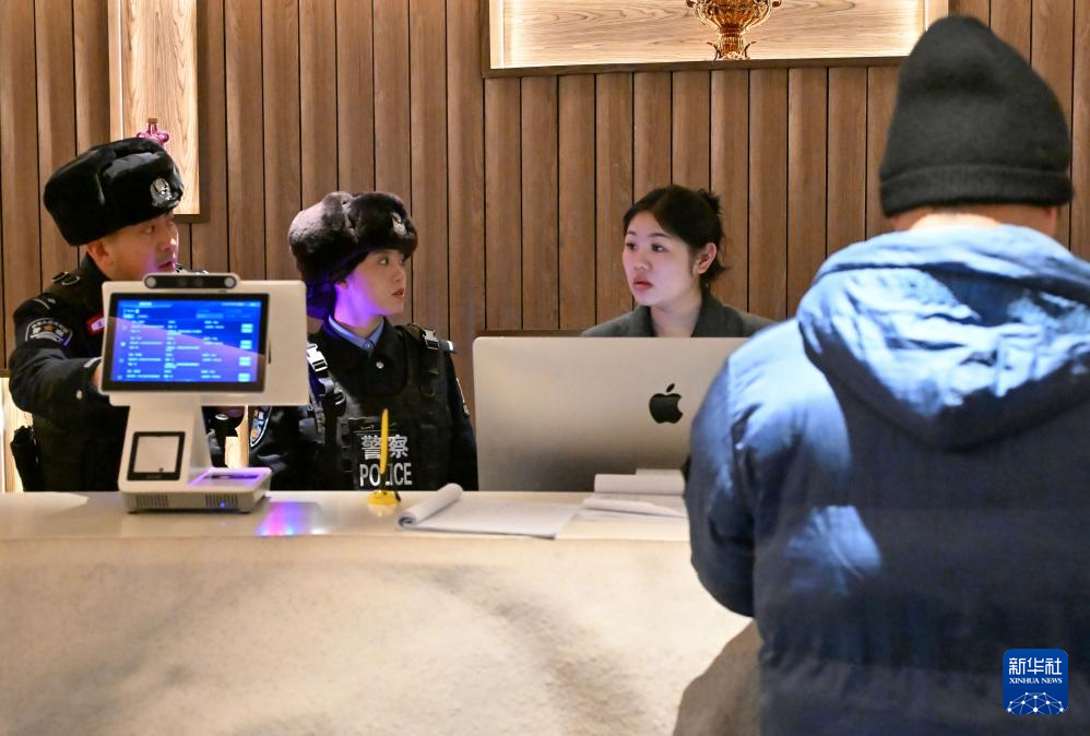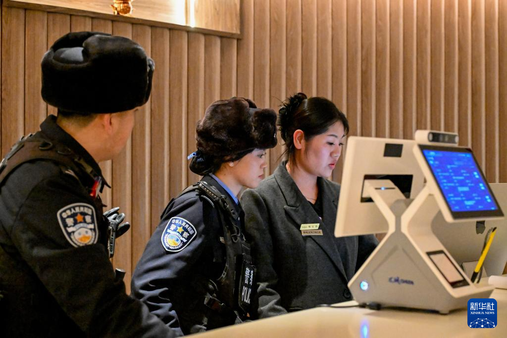 3月7日,在新疆阿勒泰地区禾木村,蒋慧芳(中)和同事在检查一家酒店住客信息登记情况。