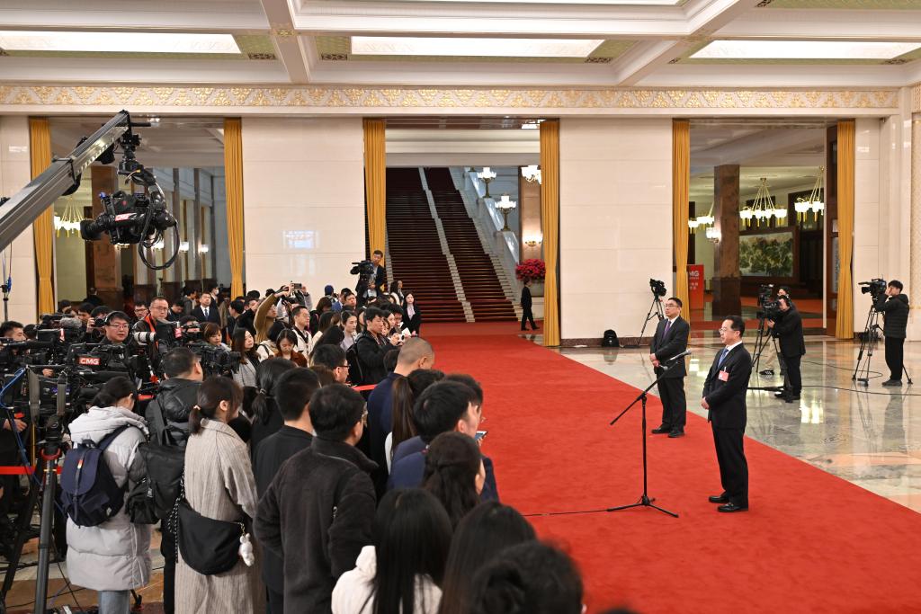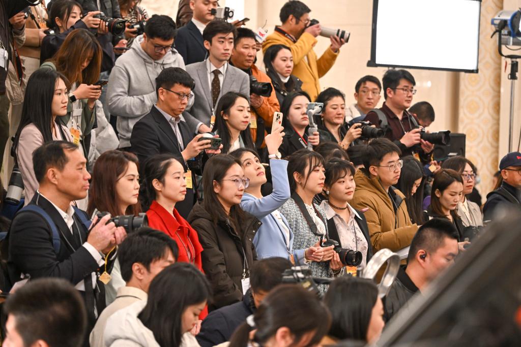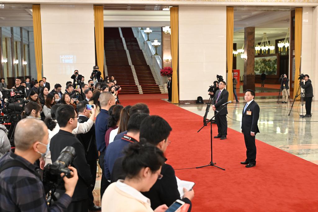 3月8日,第十四届全国人民代表大会第二次会议第二场“部长通道”集中采访活动在北京人民大会堂举行。这是记者在现场采访。